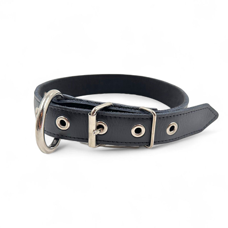 Fleksas natūralios odos antkaklis šuniui su dideliu, metaliniu žiedu pavadėliui prisegti ir kaprono juosta iš vidinės pusės, padedančia antkakliui išlaikyti formą, neišsitampyti ir nesutrūkti.