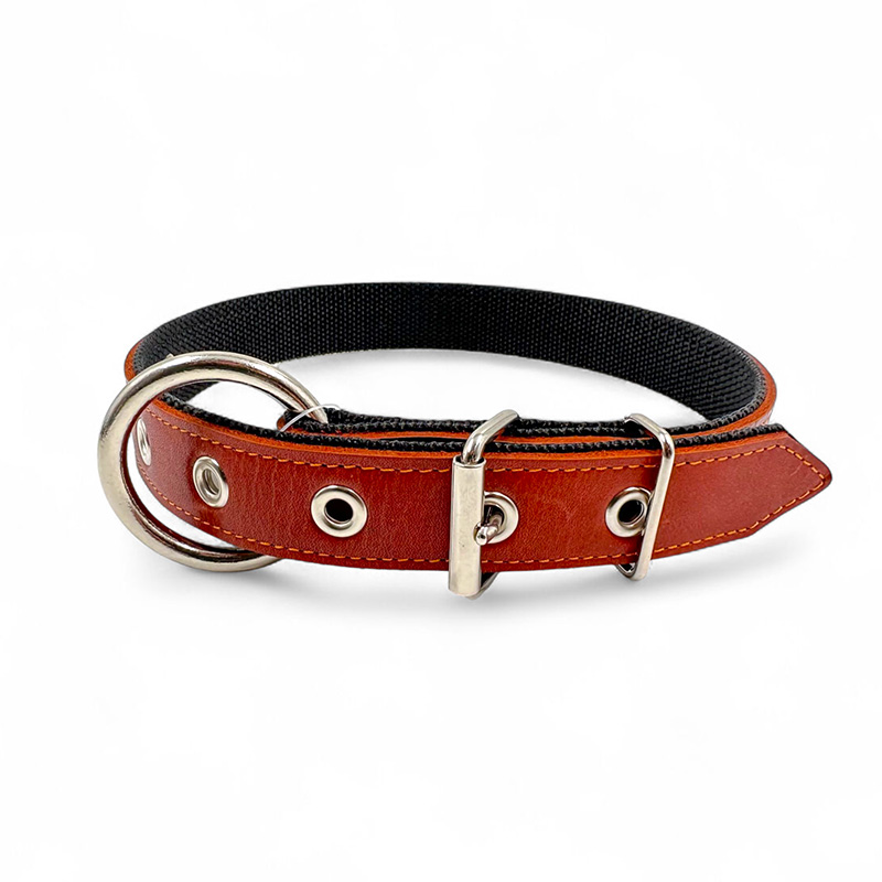 Fleksas natūralios odos antkaklis šuniui su dideliu, metaliniu žiedu pavadėliui prisegti ir kaprono juosta iš vidinės pusės, padedančia antkakliui išlaikyti formą, neišsitampyti ir nesutrūkti.