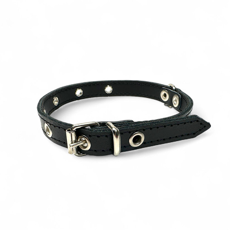 Fleksas natūralios odos antkaklis šuniui su metaliniu pusžiedžiu pavadėliui prisegti ir metalinėmis akutėmis per visą ilgį, skirtomis antkaklio dydžiui reguliuoti.