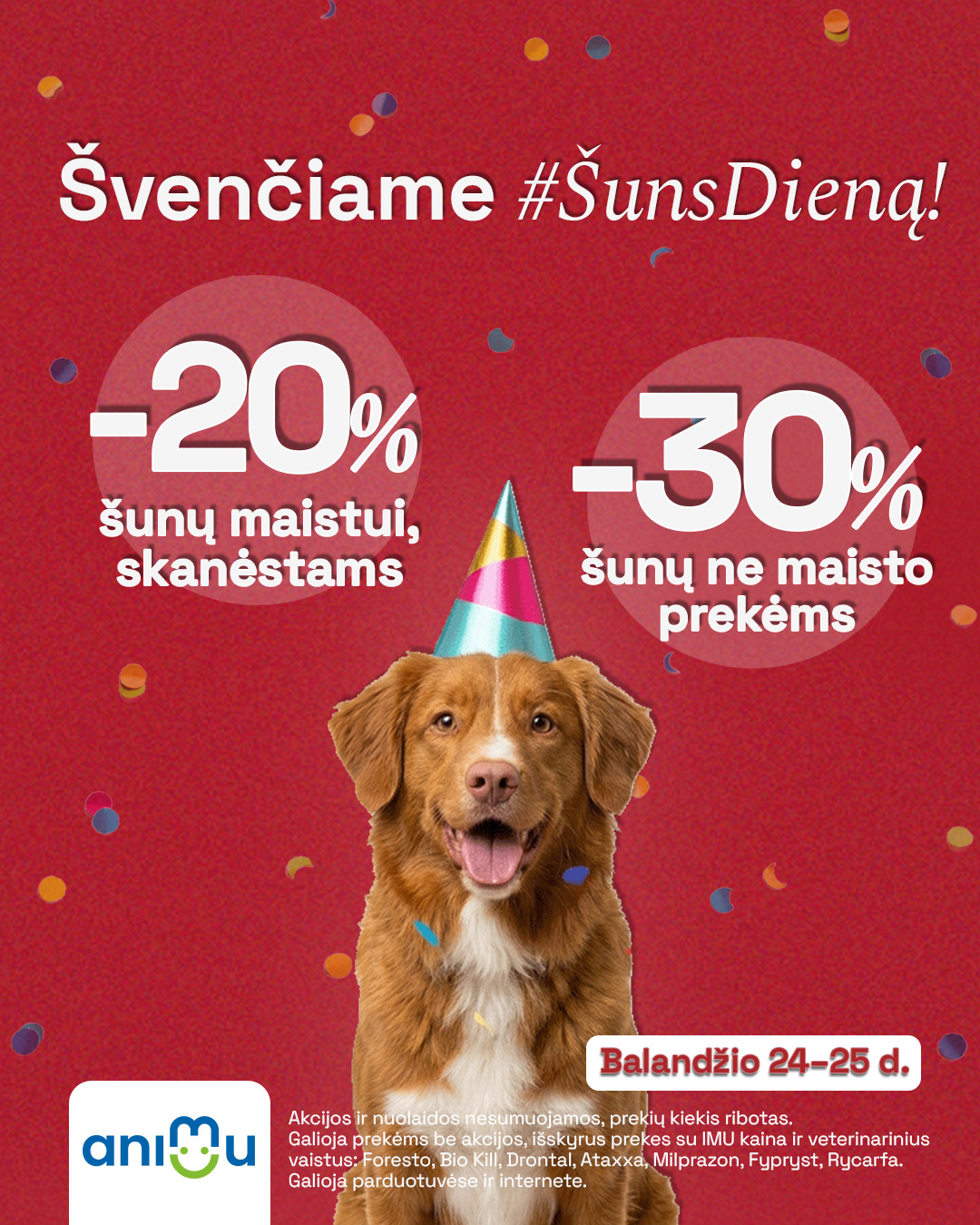 * Nuolaida taikoma šunų prekėms be akcijos. Akcijos, nuolaidos ir nuolaidų kodai nėra sumuojami. Netaikoma prekėms su IMU kaina ir atrinktiems veterinariniams preparatams: Fypryst, Ataxxa, Milprazon, Drontal, Bio Kill, Rycarfa, Foresto. Galioja balandžio 24-25 d. parduotuvėse ir internete. Prekių kiekis ribotas.