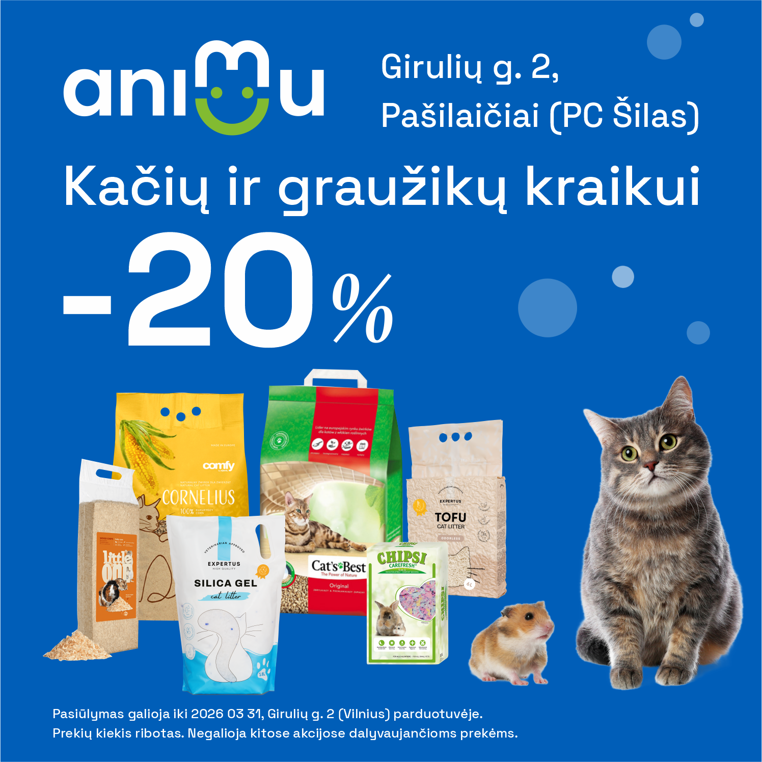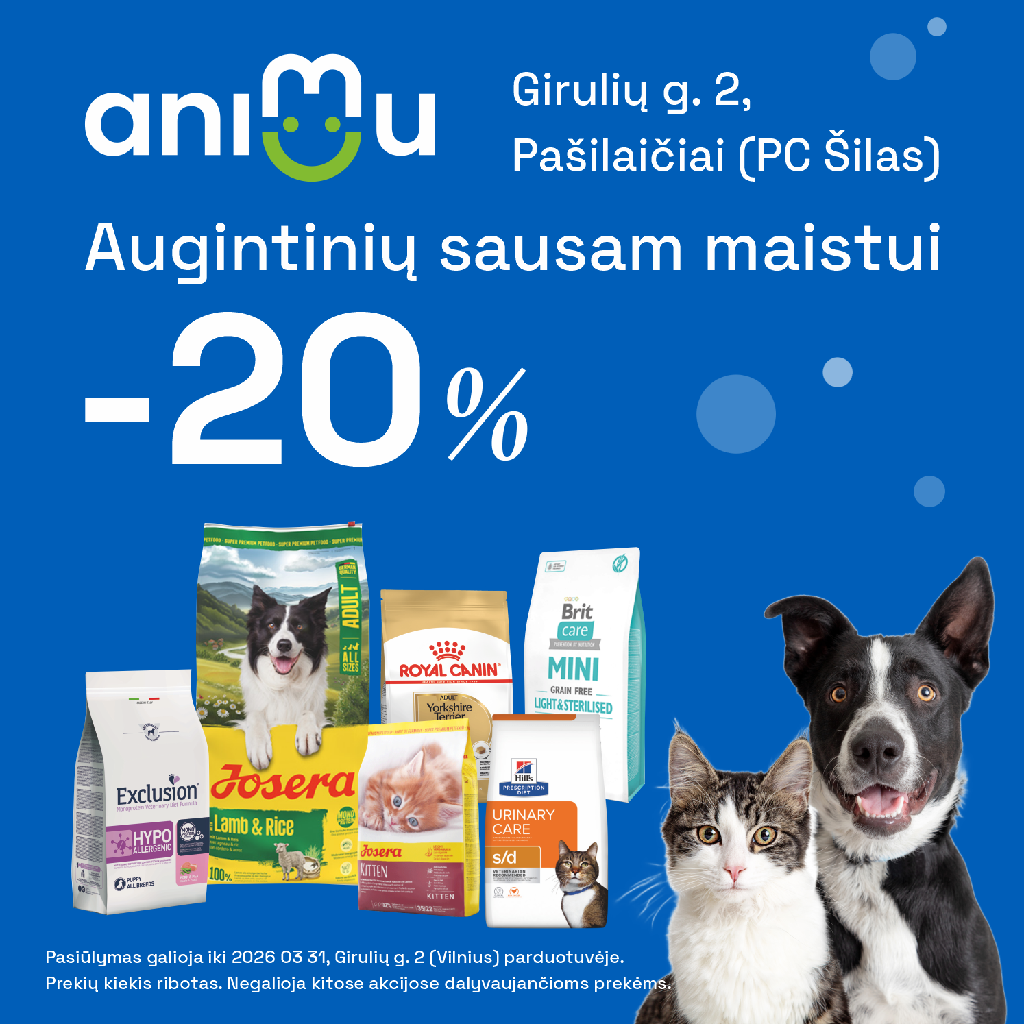 Tik kovo mėnesį Animu parduotuvėje Vilniuje Girulių g. 2 (Perkūnkiemis, PC Šilas) - ateik ir pirk gyvūnų sausą maistą ir kraiką su -20%!