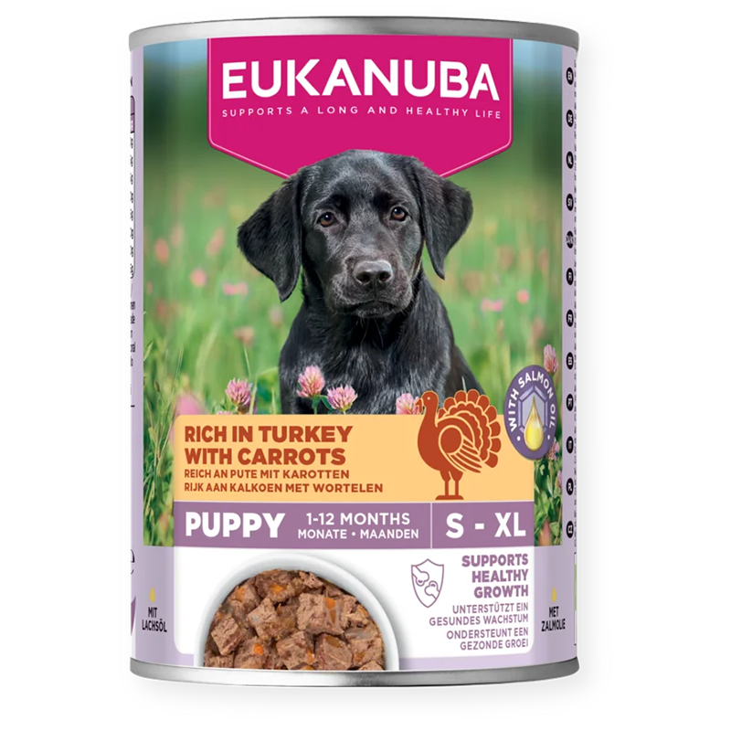 Eukanuba konservai šuniukams su kalakutiena ir morkomis be dirbtinių dažiklių, kvapiųjų medžiagų ar konservantų – šis visavertis ir subalansuotas maistas puikiai tinka įvairių veislių ir dydžių šuniukams.