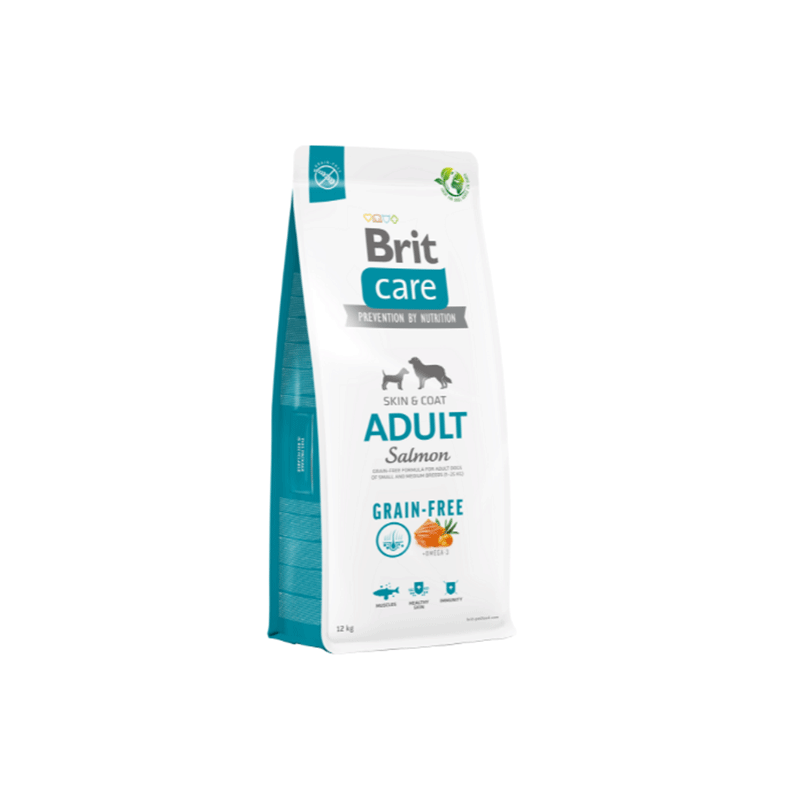Brit Care visavertis pašaras šunims. Begrūdės linijos receptas su lašiša skirtas mažų arba vidutinių veislių suaugusiems šunims.