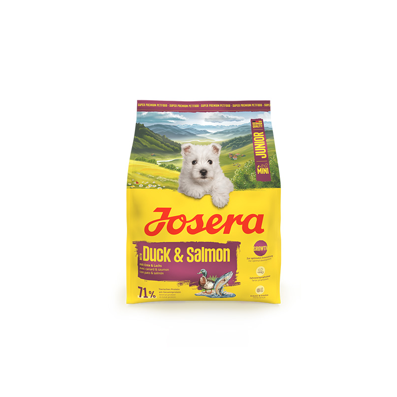 Josera sausas maistas mažų veislių, jauniems šuniukams su antiena ir lašišų mėsa, padedantis užtikrinti tinkamą šuniukų vystymąsi.